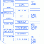 FUSE/RELAY MAP-FUSE-TRAILER TOW-TRAILER LAMPS-AUDIO-STARTER SOL. ALT-HORNS-TRALER TOW-DOOR LOCKS SEAT MOTORS-AIR SUSP PUMP-IG SW-IG SW-LPS. FUSE-EEC-ABS CONT-HTD BKLITE-ABS PUMP-FUEL PUMP-IGN COIL-RELAY-HORN RELAY-ABS POWER RELAY-AIR SUSP PUMP RELAY Ford Contour SVT 1998 Fuse Panel/Board – Fuse Symbol Map