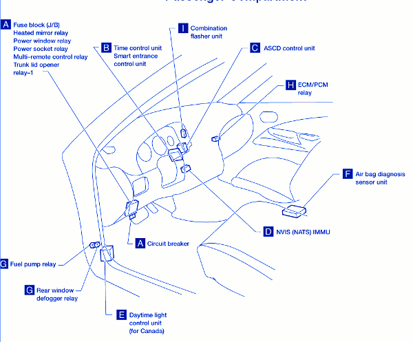 | A | Fuse Block (J/B) Heated Mirror Relay, Power Window Relay, Power Socket Relay, Multi-Remote Control Relay, Trunk Lid Opener Relay-1, Circuit Breaker |