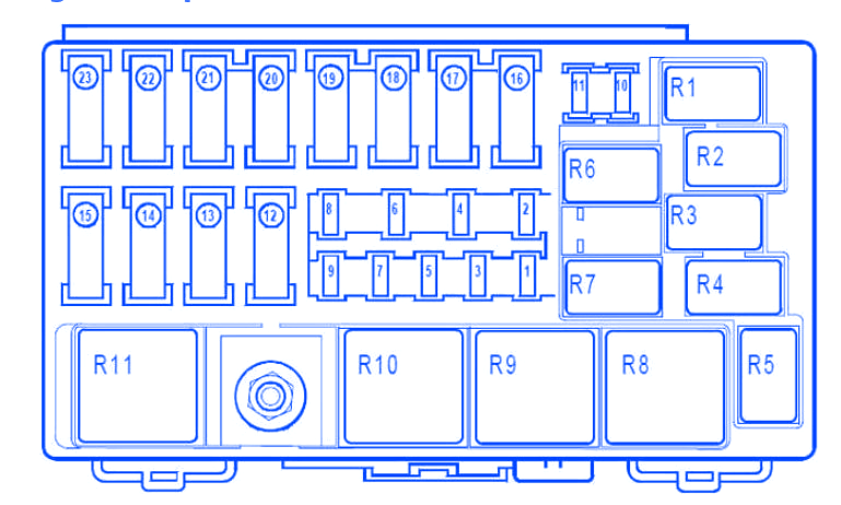 Symbol Relay Map Relay R1 F4R – G9T – P9X: Additional heater 1 R2 F4R – G9T: Low speed fan unit with heating V4Y – P9X: Fan unit with air conditioning R3 — R4 — R5 F4R – G9T – P9X: Additional heater 3 R6 F4R – G9T: Fuel pump V4Y: Injection R7 F4R – G9T – P9X: Diesel heater V4Y: Stepper motor safety R8 Injection locking R9 F4R – G9T: Low speed fan unit with air conditioning V4Y – P9X: Fan unit with air conditioning R10 Fan unit with air conditioning R11 F4R – G9T – P9X: Additional heater 2