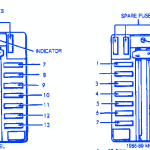 Fuse SymbolAmpsFuse Map110ADome Light215AStoplights315AHazard410AHeadlight Pop-Up Motors515AMotor Antenna615ATaillights720AHeater815AHorn915AWiper1010ARadio1110AGauges1210ATurn Signal1310ABack-Up Lights Fuse SymbolAmpsFuse Map110ADome Light215AStoplights315AHazard410AHeadlight Pop-Up Motors520AHeater615ATaillights710AAir Conditioner815AAntenna Motors915AHorn1015AWiper1110ARadio1210ADefogger Relay1310ATurn Signals1410ABack-Up Lights Chrysler Conquest 2.6L 1987 Fuse Panel/Board – Fuse Symbol Map