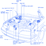 Description-1Cooling Fan Relay (Blue)-2Battery-3Headlamp Relay-4Fuse, Fusible Link and Relay Box-5Wiper Amplifier-6Starter Relay (Blue)-7Wiper Motor-8Actuator (For Anti-Lock Brake System)-9ASCD Actuator-10ASCD Pump-11Daytime Light Control Unit (For Canada)-12TCS Relay-13Center Crash Zona Sensor (For Air Bag System)-14Power Transistor Unit RH-15Power Transistor Unit LH-16Daytime Light Cancel Relay Infinity Q45 1997 Electrical Circuit Symbol Map