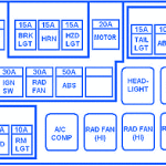 Fuse SymbolAmpsFuse MapPassenger Compartment110AAnti-Theft210ATurn Signal310ABackup Lights415AAMP530AHeater610ADoor Lock720AWiper810AMeters930ARear Window Defogger1020ASunroof1110AELC-41215ACigarette Lighter1310AHeater Relay14-Spare Fuse Mitsubishi Eclipse Spider GS-T 2002 Passenger Compartment Fuse Panel/Board – Fuse Symbol Map