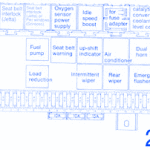 FUSE NO.AMPSCIRCUIT130ARadiator Fan210AStop Lights315ACigarette Lighter, Radio, Clock, Interior Lights, Central Locking System415AEmergency Flasher System515AElectric Fuel Pump6-Vacant710ATail, Parking and Side Marker Lights Left810ATail, Parking and Side Marker Lights Right910AHigh Beam Right, High Beam Indicator Light1010AHigh Beam Left1115AWindshield Wiper/Washer1215ARear Window Wiper/Washer, Coolant Level Checking Device, Outside Rear View Mirror Adjustment1315ARear Window Defogger, Heated Rear View Mirror1420AFresh …
